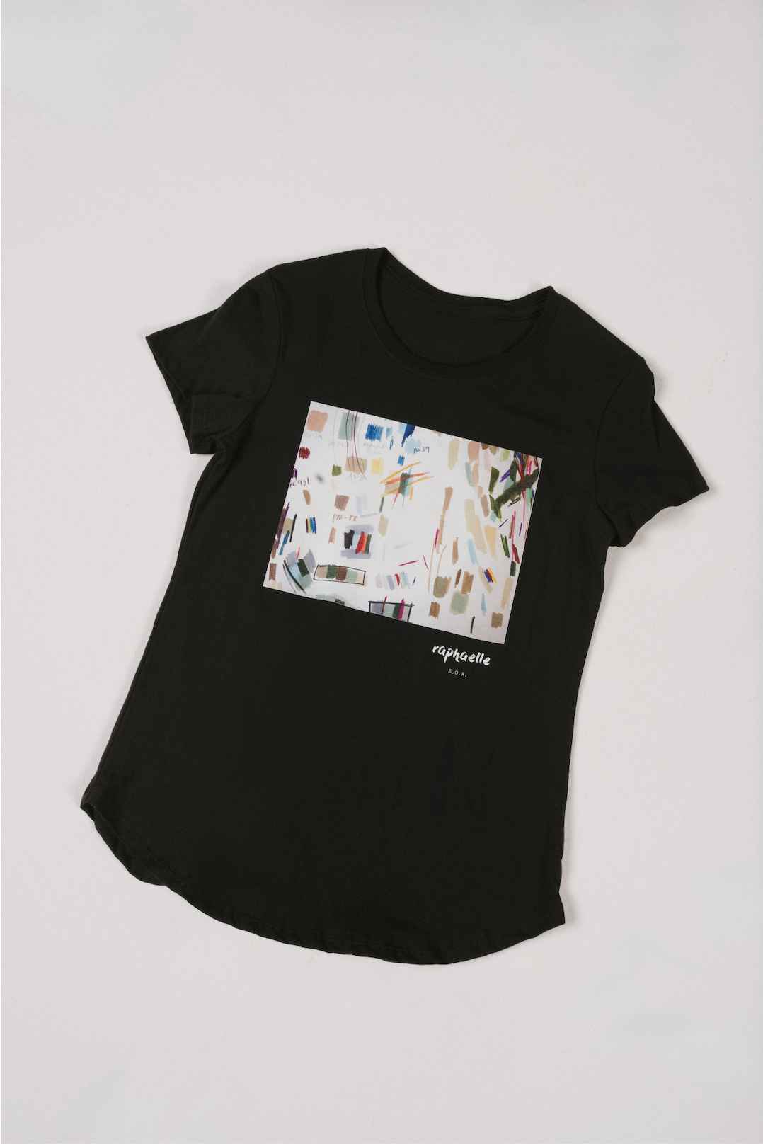 The Studio T showcases a sketch taken directly from a Raphaelle S.O.A. sketchbook. The sketch shows the process of selecting colors for a fashion collection. The numbers seen in the artwork correspond to the specific colors selected. You can see the experimentation of the design process and feel the speed, energy, and real-time thinking of creating a fashion color palette.