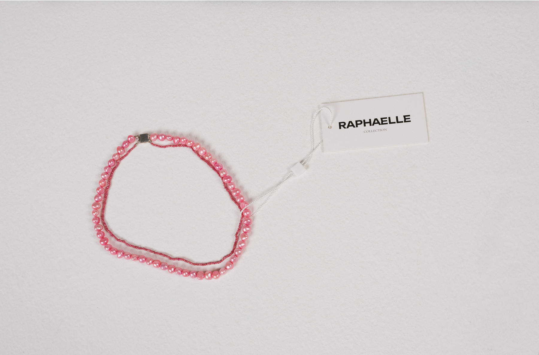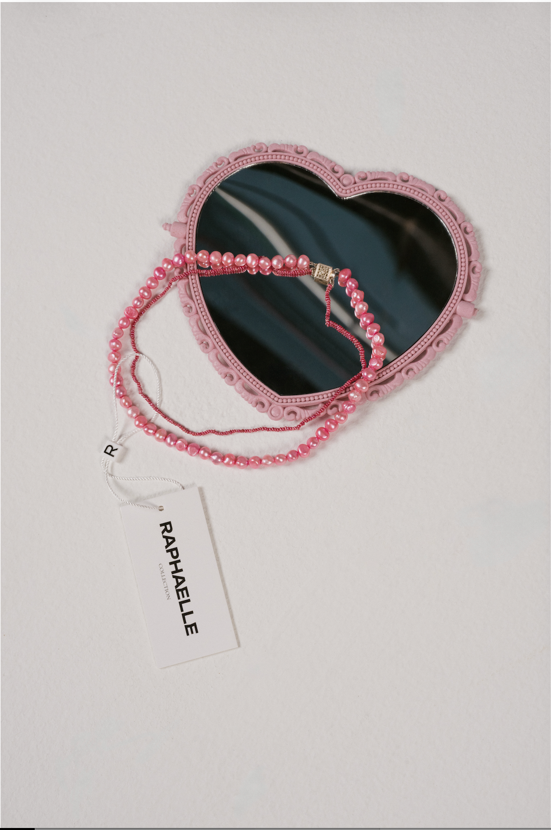 Double strand pearl necklace in raspberry cream. Pearl Clasp with silver plated filagree.