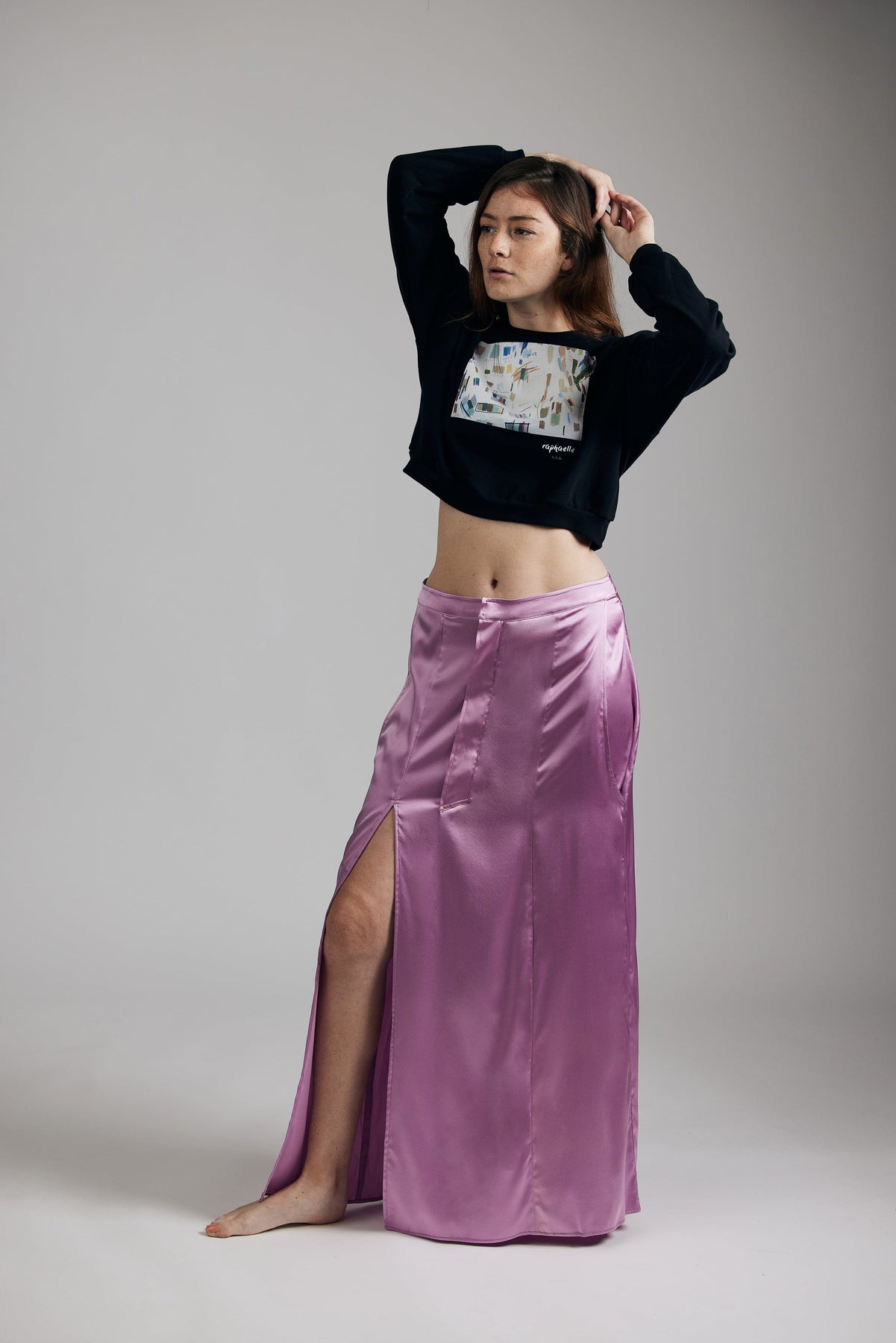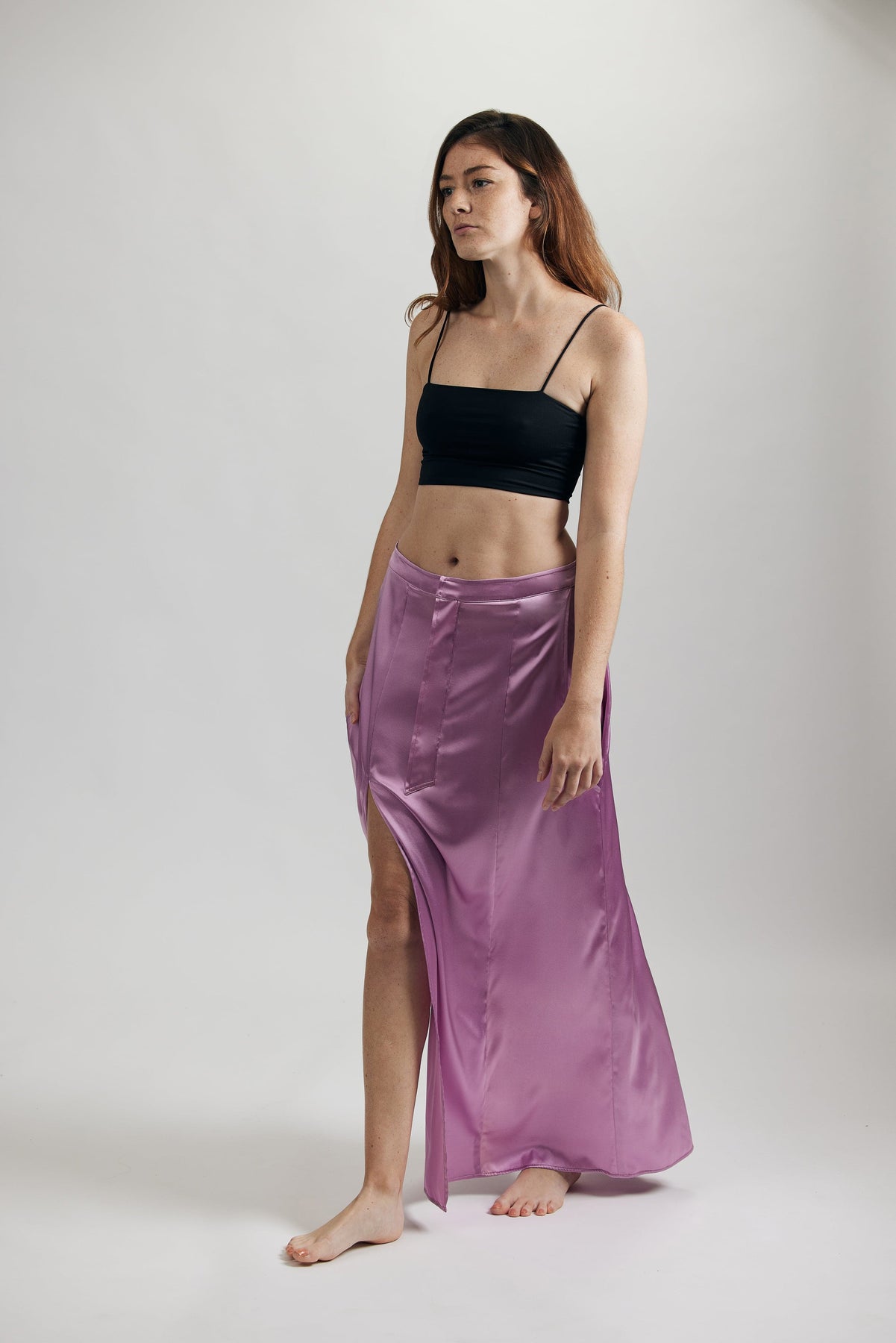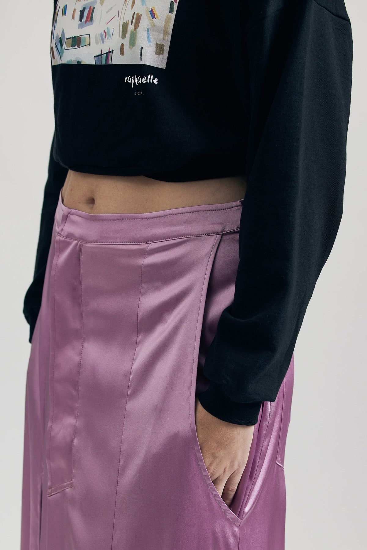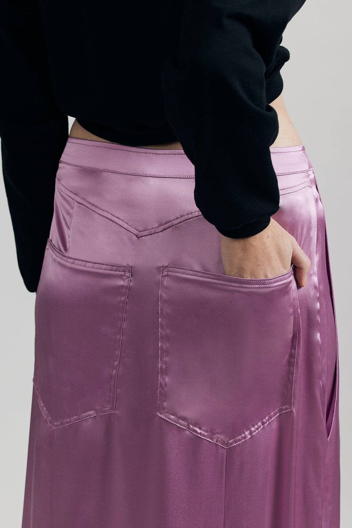 The Silk Skater Skirt's lounging silhouette contrasts elevated silk with sportswear details. Stretch Silk fabric with 90s American Jeans styling details: Oversized size pockets, elongated center fly zip, low hanging back pockets, "V" back detail and side slit.